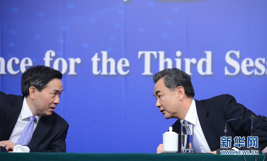 ??? 十二屆全國人大三次會議新聞中心于3月8日(星期日)10時在梅地亞中心多功能廳舉行記者會,邀請外交部部長王毅就中國的外交政策和對外關系相關問題回答中外記者提問。圖為外交部部長王毅與記者會主持人交流。新華網/中國政府網 郭小天 攝