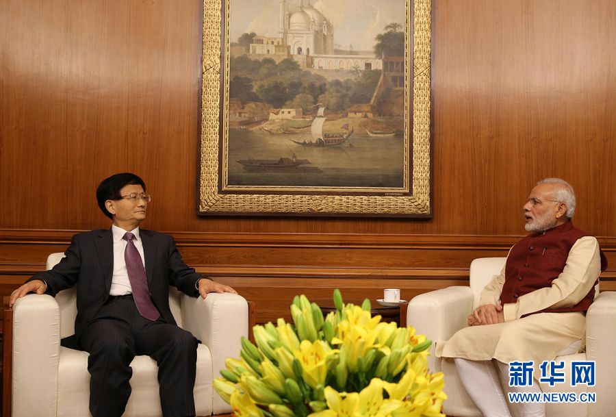 ????11月9日,印度總理莫迪(右)在新德里會見到訪的習近平主席特使、中共中央政治局委員、中央政法委書記孟建柱。 新華社記者李明攝