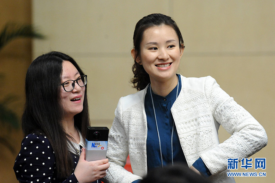 十二屆全國人大四次會議新聞中心于3月8日(星期二)10時在梅地亞中心多功能廳舉行記者會,邀請外交部部長王毅就“中國的外交政策和對外關系”的相關問題回答中外記者的提問。圖為發布會現場的美女記者。新華網/中國政府網記者 陳競超攝