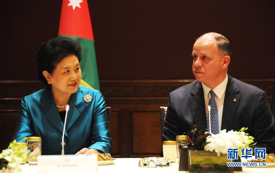 4月20日,在約旦首都安曼,約旦代國王費薩爾(右)會見中國國務院副總理劉延東。新華社記者林曉蔚攝
