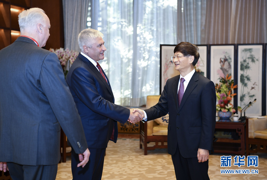 9月26日,中共中央政治局委員、中央政法委書記孟建柱在北京會見來華出席國際刑警組織第86屆全體大會的俄羅斯內務部長科洛科利采夫(左二)和俄聯邦調查委員會主席巴斯特雷金(左一)。新華社記者 張領 攝