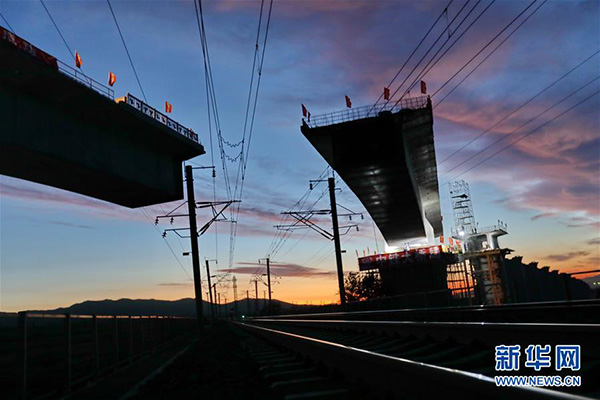 河北省懷來縣境內的新建京張高鐵跨大秦鐵路線土木特大橋連續梁在轉體中(9月17日攝)。新華社記者 楊世堯 攝