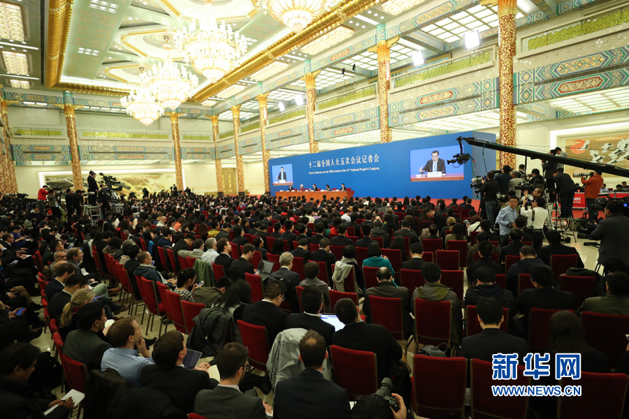 3月15日上午,國務(wù)院總理李克強(qiáng)在人民大會(huì)堂三樓金色大廳會(huì)見采訪十二屆全國人大五次會(huì)議的中外記者并回答記者提出的問題。圖為記者會(huì)現(xiàn)場(chǎng)。新華網(wǎng)/中國政府網(wǎng) 翟子赫 攝