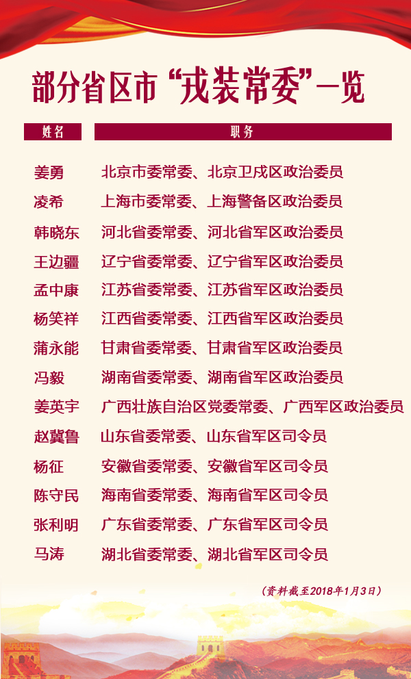 1月2日起,安徽、湖北、遼寧、江蘇、江西、山東、廣西、海南、甘肅、廣東、湖南、北京等省份“戎裝常委”集中亮相,其中多人系首次擔任省級黨委常委。至此,全國已有十余省區市“戎裝常委”陸續回歸。