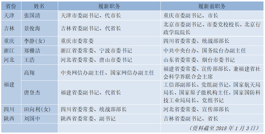 2017年12月,山東省委常委、煙臺市委書記王浩調任河北省委常委、唐山市委書記,河北省委常委、宣傳部部長田向利接替李靜出任四川省委常委、統戰部部長,李靜轉任重慶市委委員、常委。此番履新前,王浩一直在山東任職,田向利一直在河北任職,李靜一直在四川任職。