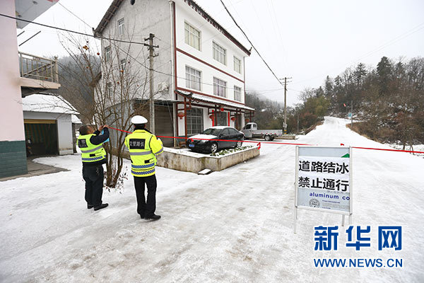 因道路坡陡,路面結(jié)冰,湖北五峰土家族自治縣“路長(zhǎng)”朱漢軍(左)和袁樂(lè)軍(右)在劉家坳路段拉起簡(jiǎn)易警戒線(1月5日攝)。新華社記者 王自宸 攝