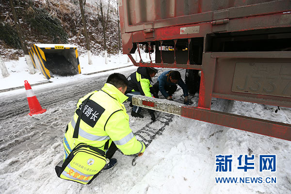 湖北五峰土家族自治縣仁和坪鎮(zhèn)“路長(zhǎng)”高恩強(qiáng)(左一)在楊柳池村到金家垴路段指導(dǎo)過(guò)往貨車安裝防滑鏈(1月5日攝)。新華社記者 王自宸 攝