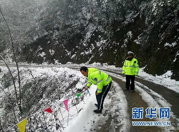 在湖北長(zhǎng)陽(yáng)土家族自治縣磨市鎮(zhèn)烏缽池村級(jí)公路,“路長(zhǎng)”魏遠(yuǎn)義(右)和張昌軍(左)在積雪塌方路段拉警示繩(1月7日攝)。新華社記者 王自宸 攝