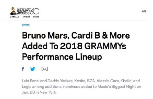 2018格萊美頒獎典禮將從洛杉磯移師紐約