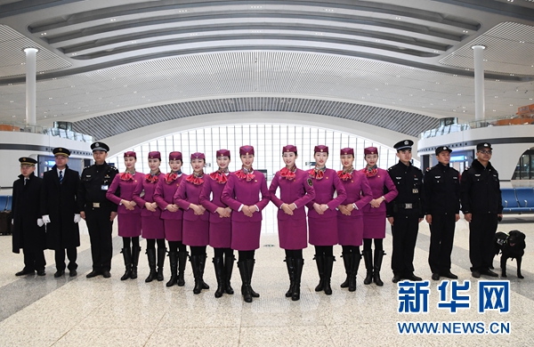 1月16日,擔任渝貴鐵路首發列車值乘工作的司機、乘務員、乘警等在重慶西站亮相。 新華社記者 王全超 攝