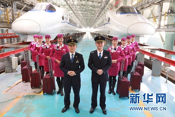 1月16日,擔任首發列車值乘工作的貴陽客運段司機和乘務員在貴陽亮相。新華社記者劉續攝