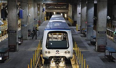 為了保證小火車安全運(yùn)行,在位于地下十六米的首都機(jī)場博維公司維修車間,原本三節(jié)一組的列車被拆分開,十余位工作人員正在對捷運(yùn)列車進(jìn)行例行檢修。隨著千斤頂?shù)木徛还?jié)車廂被抬升到離地一米的高度,兩名工作人員持手電對車底進(jìn)行檢修。工作人員介紹,在列車?yán)塾?jì)行駛達(dá)9600公里以上時(shí)都要進(jìn)行一次系統(tǒng)檢修。