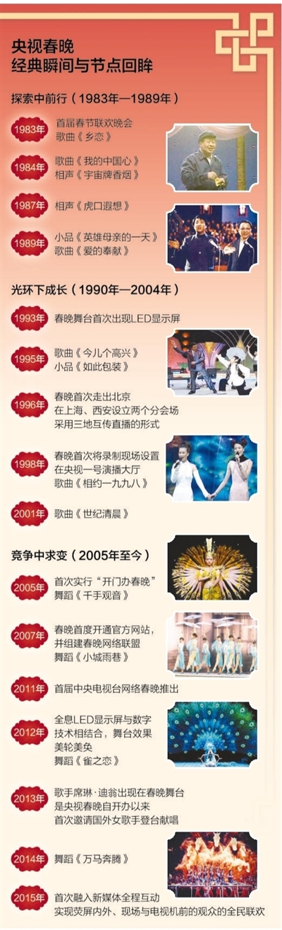 春晚的自我更新還體現(xiàn)在與不同時(shí)代的新興媒體展開合作。如八九十年代的電話熱線,90年代末期興起短信投票,以及新世紀(jì)以來(lái)與微博、支付寶、微信的合作。正是這種在表演形式、舞臺(tái)風(fēng)格上既保持固有特色,又不斷求新求變的創(chuàng)新精神,使得春晚成為每年最受關(guān)注的綜藝大餐。