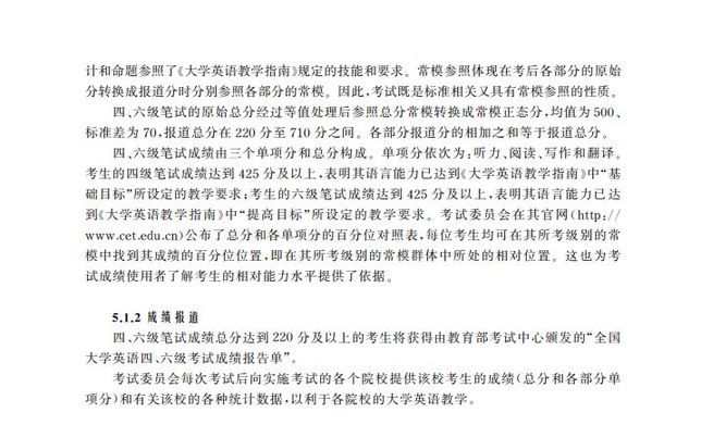 中國青年報(ID:zqbcyol)注意到,《全國大學生英語四、六級考試大綱》(2016修訂版)顯示,“考生的四級筆試成績達到425分及以上,表明其語言能力已達到《大學英語教學指南》中‘基礎目標’所設定的教學要求;考生的六級筆試成績達到425分及以上,表明其語言能力已達到《大學英語教學指南》中‘提高目標’所設定的教學要求?!?/p>