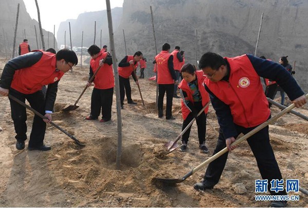 3月12日,山西省運城市稷山縣學雷鋒志愿者協會的志愿者們在荒山綠化點義務植樹。 新華社發(栗盧建 攝)