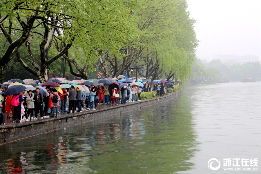 4月5日,清明小長假首日,杭州細雨綿綿,西湖景區游客絡繹不絕。杭城雖降雨降溫,但西湖景區前來賞花踏青的游客如潮,斷橋似人橋。(浙江在線拍友 里爾 柱子 攝)