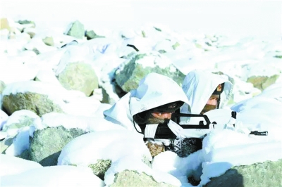 戰士身著新式雪地偽裝服潛伏