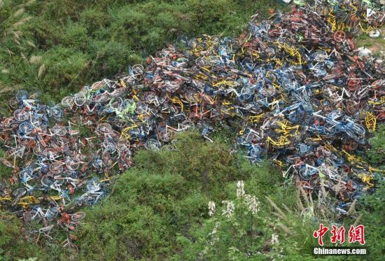 資料圖:雜亂堆放著一片共享單車(chē)。 中新社記者 張斌 攝