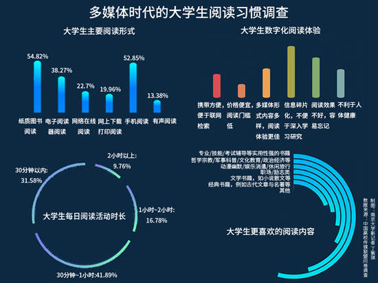 中國(guó)高校傳媒聯(lián)盟調(diào)查結(jié)果顯示,在閱讀時(shí)長(zhǎng)上,31.58%的受訪大學(xué)生日均閱讀時(shí)長(zhǎng)不足半小時(shí),41.89%的受訪者日均閱讀時(shí)長(zhǎng)在半小時(shí)到一小時(shí)之間,閱讀時(shí)長(zhǎng)在2小時(shí)以上的占9.76%。
