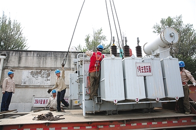 新機場跑道規劃范圍內的老變電站將于本月拆除。昨日,南各莊變電站內主變壓器拆除后吊運,宣告該變電站正式退役。