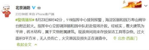 據(jù)北京市公安局消防局官方微博消息,5月23日6時(shí)42分,119指揮中心接到報(bào)警,海淀區(qū)頤和園萬壽山闕畢臺(tái)附近起火。指揮中心立即調(diào)派頤和園中隊(duì)趕赴現(xiàn)場撲救。