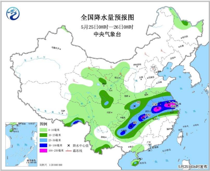 中央氣象臺(tái)5月25日06時(shí)繼續(xù)發(fā)布暴雨黃色預(yù)警:預(yù)計(jì)25日08時(shí)至26日08時(shí),河南東南部、蘇皖中南部、上海、浙江北部、湖北中東部和西北部、湖南北部、貴州東部和南部、重慶東北部等地有大到暴雨,其中,安徽中部偏南地區(qū)、江蘇南部、湖南北部等地局地有大暴雨(100~160毫米);上述部分地區(qū)并伴有短時(shí)強(qiáng)降水、雷暴大風(fēng)等強(qiáng)對(duì)流天氣,最大小時(shí)降水量40~60毫米。