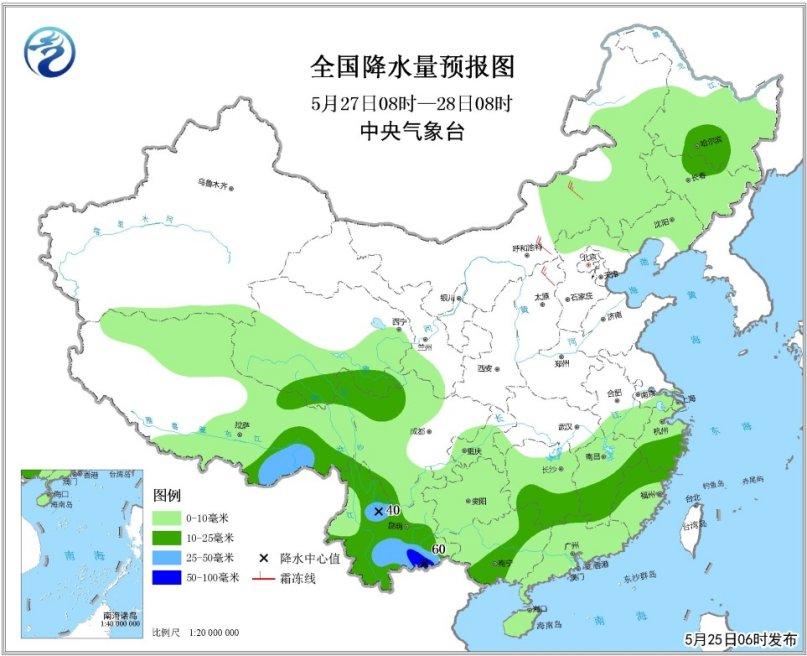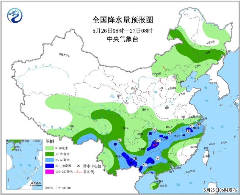 全國(guó)降水量預(yù)報(bào)圖(5月25日08時(shí)-26日08時(shí))