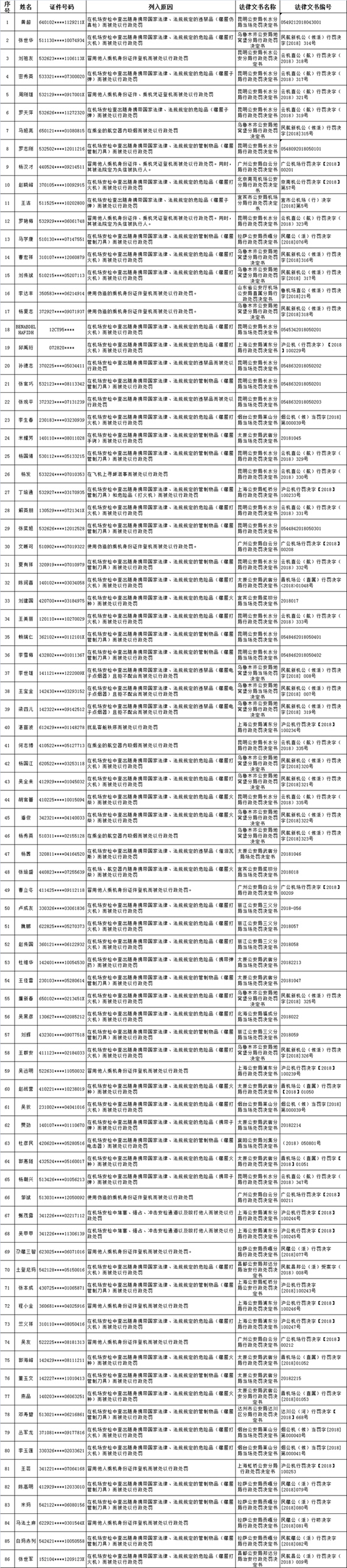 據民航局網站消息,6日1日,民航局公布首批《民航限制乘坐民用航空器嚴重失信人名單》,86人因“在機場安檢中查出隨身攜帶國家法律、法規規定的危險品、違禁品、管制物品而被處以行政處罰”、“冒用他人乘機身份證件、乘機憑證登機而被處以行政處罰”等行為被列入民航特定嚴重失信人名單記錄,自6月1日起被限制乘坐民用航空器,限制期限為一年。
