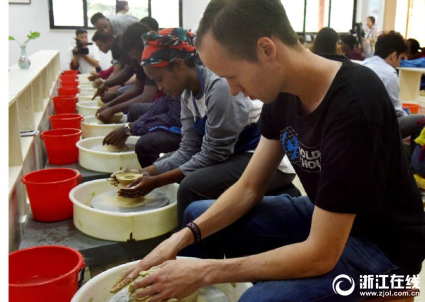 6月3日,浙師大外國(guó)留學(xué)生,在武義漢坊婺窯體驗(yàn)館學(xué)陶藝。婺州窯,始于三國(guó)時(shí)期,是金華市第四批國(guó)家非物質(zhì)文化遺產(chǎn)代表性項(xiàng)目。當(dāng)日,來(lái)自美國(guó)、俄羅斯等30多個(gè)國(guó)家的浙江師范大學(xué)70多名留學(xué)生,在武義漢坊婺窯體驗(yàn)館開心學(xué)習(xí)拉坯、修坯、上釉等陶藝生產(chǎn)環(huán)節(jié)。留學(xué)生們還把自己的國(guó)籍、姓名刻在親手做的陶瓷器皿上,委托燒制、留作紀(jì)念。(拍友 張建成 攝)
