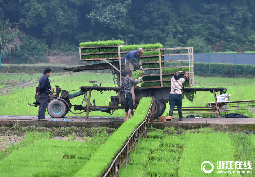 6月4日,武義縣一育秧工廠員工忙著為訂單農戶起運單季稻秧苗。隨著“芒種”節氣的到來,武義縣農民搶抓有利時機,加快翻耕平整水田,搶種單季水稻。(浙江在線拍友 張建成 攝)