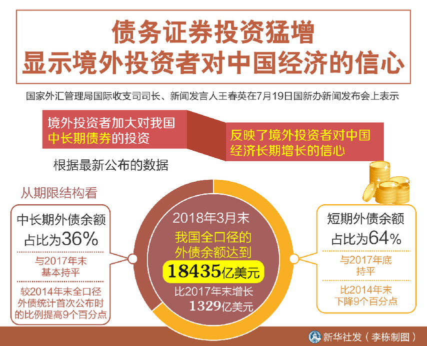新華社北京7月19日電(記者劉開(kāi)雄)“我們觀察新增長(zhǎng)的外債中,有八成是債務(wù)證券。”國(guó)家外匯管理局國(guó)際收支司司長(zhǎng)、新聞發(fā)言人王春英在19日國(guó)新辦新聞發(fā)布會(huì)上表示,境外投資者加大對(duì)我國(guó)中長(zhǎng)期債券的投資,反映了境外投資者對(duì)中國(guó)經(jīng)濟(jì)長(zhǎng)期增長(zhǎng)的信心。