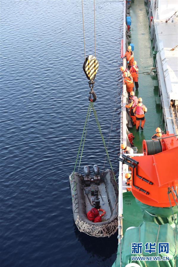 回收浮球的橡皮艇準(zhǔn)備就位。長(zhǎng)長(zhǎng)的懸梯從“雪龍”號(hào)上放下,5名考察隊(duì)員依次下到橡皮艇上,頂著凜冽海風(fēng)直奔浮球處。“撈球”工作進(jìn)展得十分順利,不久,橡皮艇就拖著鮮艷的浮球由遠(yuǎn)及近駛向“雪龍”號(hào)的后甲板作業(yè)區(qū)。潛標(biāo)被成功收回,相關(guān)考察隊(duì)員隨即對(duì)潛標(biāo)開(kāi)展維護(hù)和數(shù)據(jù)采集工作。