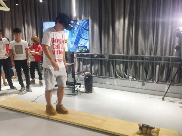 在山路騎行體驗區,體驗者需佩戴VR眼鏡騎車,屏幕上的山路場景會隨移動轉換,時而上坡、時而急轉彎、時而平緩……車身也會隨場景左右擺動。在高空涉險體驗區,參與者小心翼翼的在平地上移動著腳步,原來在vr的世界里面,體驗者正站在高樓外狹窄的木板上試圖“營救”蜷縮在木板盡頭的“虛擬”小貓。