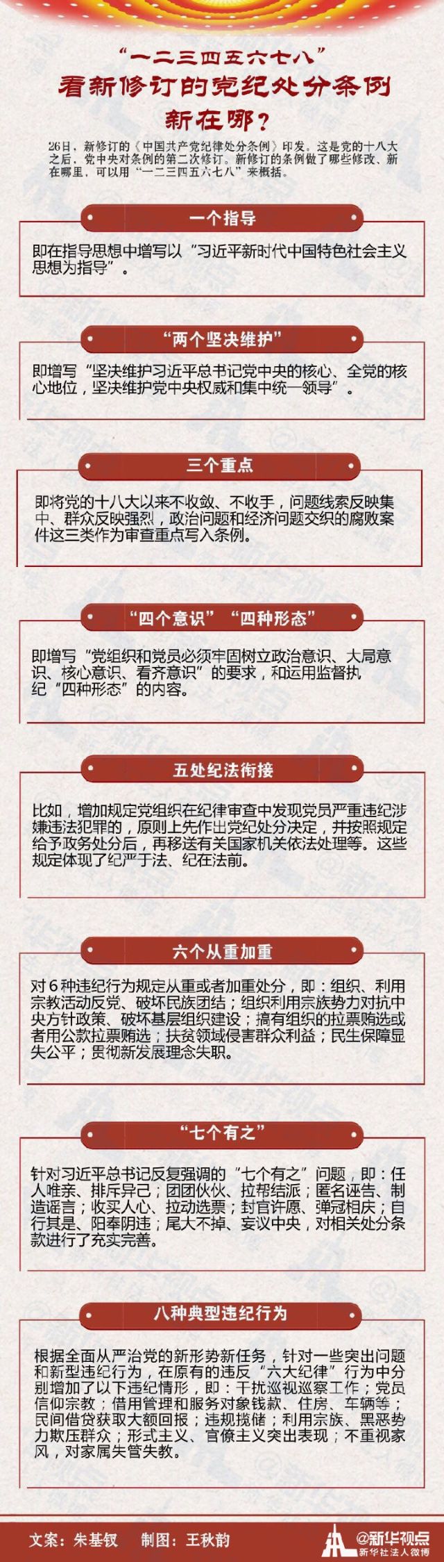 黨紀處分條例是規范所有黨組織和黨員行為的基礎性法規,在黨內法規體系中居于十分重要的地位。上次修訂是2015年,于2016年1月1日正式施行。