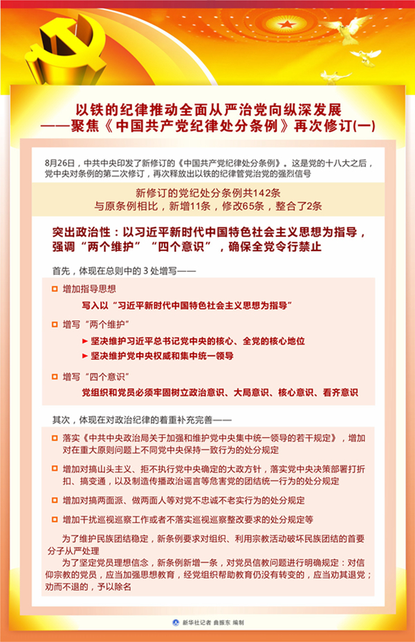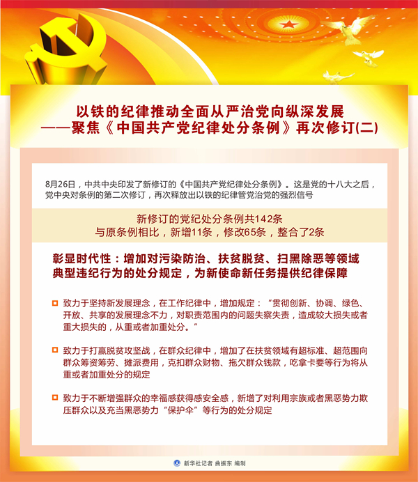 新華社北京8月27日電 題:以鐵的紀律推動全面從嚴治黨向縱深發展——聚焦《中國共產黨紀律處分條例》再次修訂