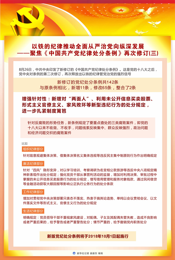 新版黨紀處分條例將于2018年10月1日起施行。它的頒布施行必將不斷提高紀律建設的政治性、時代性、針對性,以更加科學、更加嚴密、更加有效的思路舉措,推動全面從嚴治黨取得更大戰略性成果。