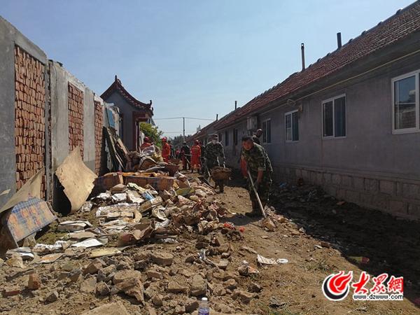 隨后,記者從壽光市稻田鎮小河崖頭村看到,江蘇省鹽城市消防支隊100名官兵正在該村清淤排水。鹽城市消防支隊相關負責人告訴記者,他們是凌晨1點到達壽光,凌晨3點進入該村進行抽水作業,清排積水。