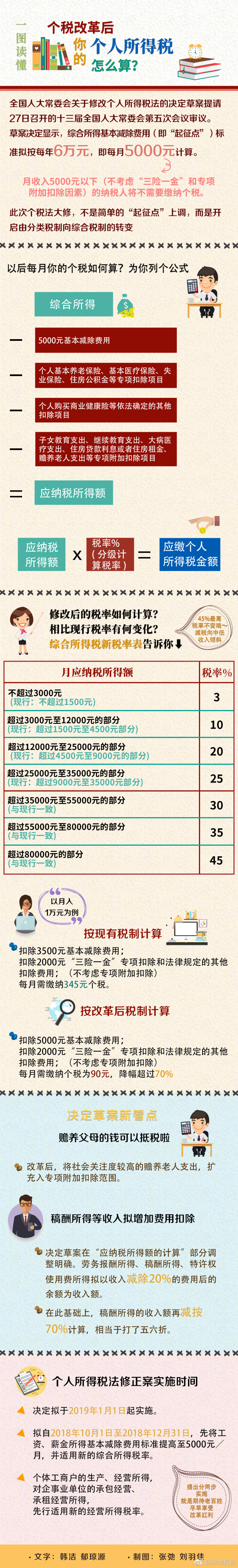 和一審稿草案相比,決定草案顯示,綜合所得基本減除費用標準,即通常說的“起征點”仍擬按每年6萬元(每月5000元)計算。