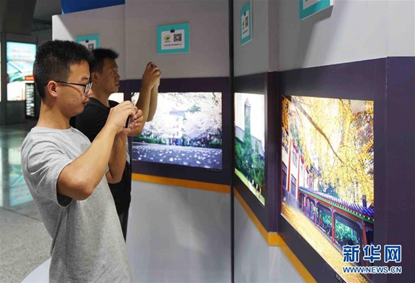 9月1日,在南京南站活動現場,新生在觀看“南京形象”主題圖片展。 新華社記者季春鵬攝