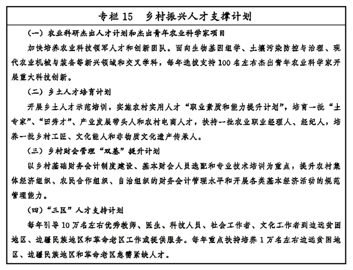 建立健全激勵(lì)機(jī)制,研究制定完善相關(guān)政策措施和管理辦法,鼓勵(lì)社會(huì)人才投身鄉(xiāng)村建設(shè)。以鄉(xiāng)情鄉(xiāng)愁為紐帶,引導(dǎo)和支持企業(yè)家、黨政干部、專家學(xué)者、醫(yī)生教師、規(guī)劃師、建筑師、律師、技能人才等,通過下鄉(xiāng)擔(dān)任志愿者、投資興業(yè)、行醫(yī)辦學(xué)、捐資捐物、法律服務(wù)等方式服務(wù)鄉(xiāng)村振興事業(yè),允許符合要求的公職人員回鄉(xiāng)任職。落實(shí)和完善融資貸款、配套設(shè)施建設(shè)補(bǔ)助、稅費(fèi)減免等扶持政策,引導(dǎo)工商資本積極投入鄉(xiāng)村振興事業(yè)。繼續(xù)實(shí)施“三區(qū)”(邊遠(yuǎn)貧困地區(qū)、邊疆民族地區(qū)和革命老區(qū))人才支持計(jì)劃,深入推進(jìn)大學(xué)生村官工作,因地制宜實(shí)施“三支一扶”、高校畢業(yè)生基層成長等計(jì)劃,開展鄉(xiāng)村振興“巾幗行動(dòng)”、青春建功行動(dòng)。建立城鄉(xiāng)、區(qū)域、校地之間人才培養(yǎng)合作與交流機(jī)制。全面建立城市醫(yī)生教師、科技文化人員等定期服務(wù)鄉(xiāng)村機(jī)制。