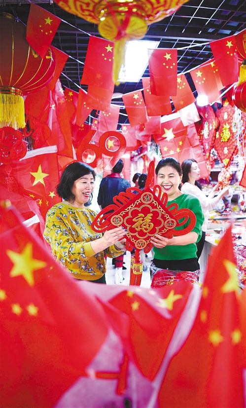 圖⑤ 9月30日,河北省保定市蓮池區(qū)西高莊亨佰麗小商品批發(fā)城,顧客在選購(gòu)國(guó)慶飾品,歡度佳節(jié)。趙昱萱 攝