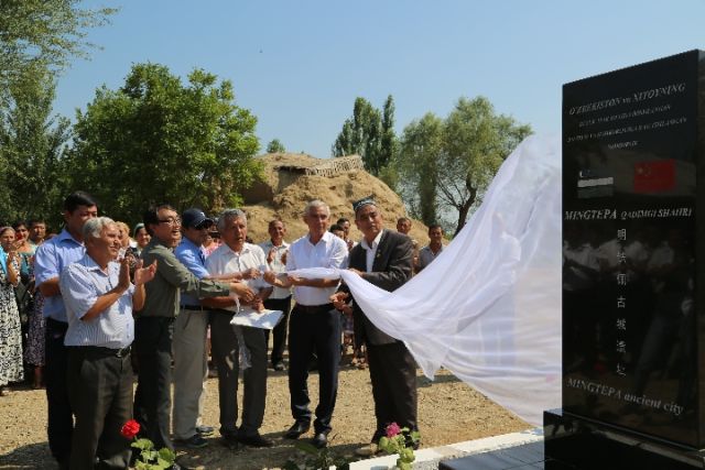 2016年6月19日,中烏聯合發掘明鐵佩遺址的紀念碑揭牌。(中國社科院考古所供圖)