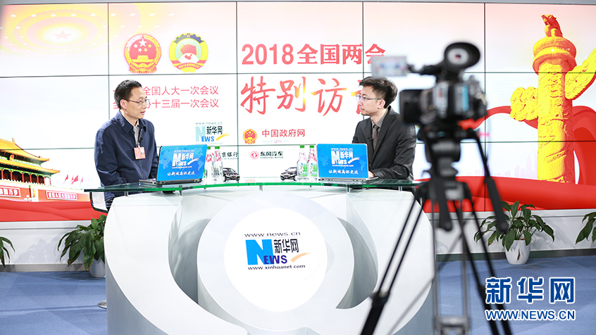 3月6日,全國人大代表、湖北省荊州市市長崔永輝(左)做客新華網(wǎng)2018全國兩會特別訪談。新華網(wǎng) 楊锘攝