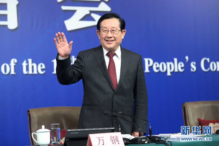 十三屆全國人大一次會議新聞中心于10日上午10時45分在梅地亞中心多功能廳舉行記者會,邀請科技部部長萬鋼、政策法規與監督司司長賀德方、創新發展司司長許倞就“加快建設創新型國家”相關問題回答中外記者提問。圖為萬鋼向記者示意。新華網/中國政府網 翟子赫 攝