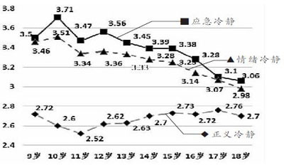 調查側重考察了兒童在應急情境、情緒激動和正義需要援手情境中的冷靜品質,發現兒童冷靜品質在遭遇不同情境中情緒調控性表現出不同的發展趨勢。在一般應急情境和情緒激動中的兒童冷靜品質分值有隨年齡增長而下降的趨勢,意味著兒童在應急與情緒激動情境下隨著年齡增長而更容易沖動,不能控制自己;而在遇到有需要援手等正義需求情境時,兒童冷靜品質的得分有隨年齡增長而升高的趨勢,意味著這種情況下,年齡越大的兒童越能控制自己的行為。