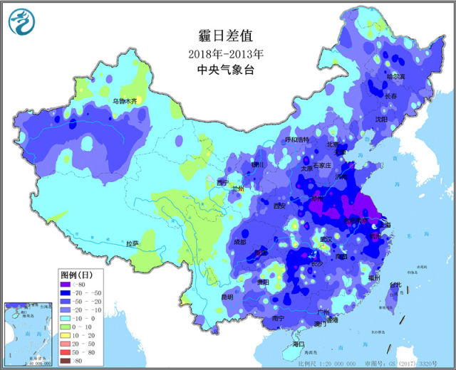 根據中央氣象臺的統計,全國大部分地區2018年霾日較2013年都有大幅下降,其中京津冀及周邊大部分地區霾日數下降超過30天,部分地區下降超過50天;長三角地區霾日數下降普遍超過50天;珠三角地區霾日數也出現明顯下降,部分地區下降超過30天;汾渭平原霾日數下降普遍超過20天;川渝地區霾日數普遍下降超過20天。