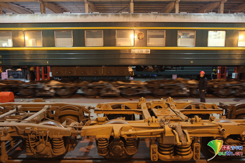 康亞斌和同事們所在的聯(lián)運檢修車間擔負著北京至烏蘭巴托、北京至莫斯科以及呼和浩特至烏蘭巴托等6趟國際旅客列車換輪任務(wù),還要對這些車輛重要部件進行定期檢修。