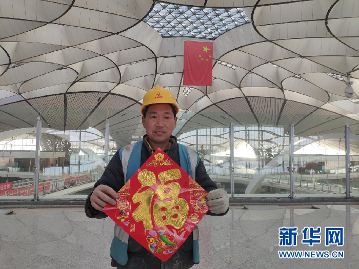 圖片說明:大興機場航站樓春節期間值守的工人舉起了“?!弊帧?攝影:新華網錢春弦