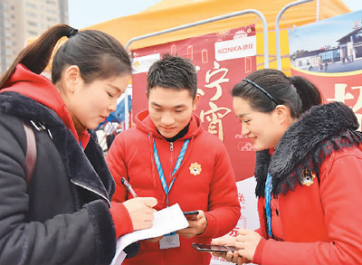 2月12日,湖北省通城縣在銀山廣場舉辦2019年推動返鄉(xiāng)就業(yè)、助力脫貧攻堅暨“春風(fēng)行動”企業(yè)用工現(xiàn)場招聘會,共推出1萬多個就業(yè)崗位,工種300余個,可滿足本縣不同年齡段勞力在家門口就業(yè)。圖為求職者在招聘會上咨詢應(yīng)聘。劉建平攝 (人民視覺)