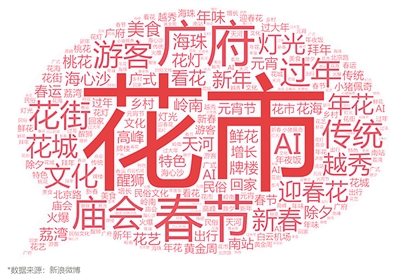 今年春節,廣州首次推出智慧AI花市,花市、燈光、花燈等成了新年熱詞。圖為廣州新年詞頻示意圖。